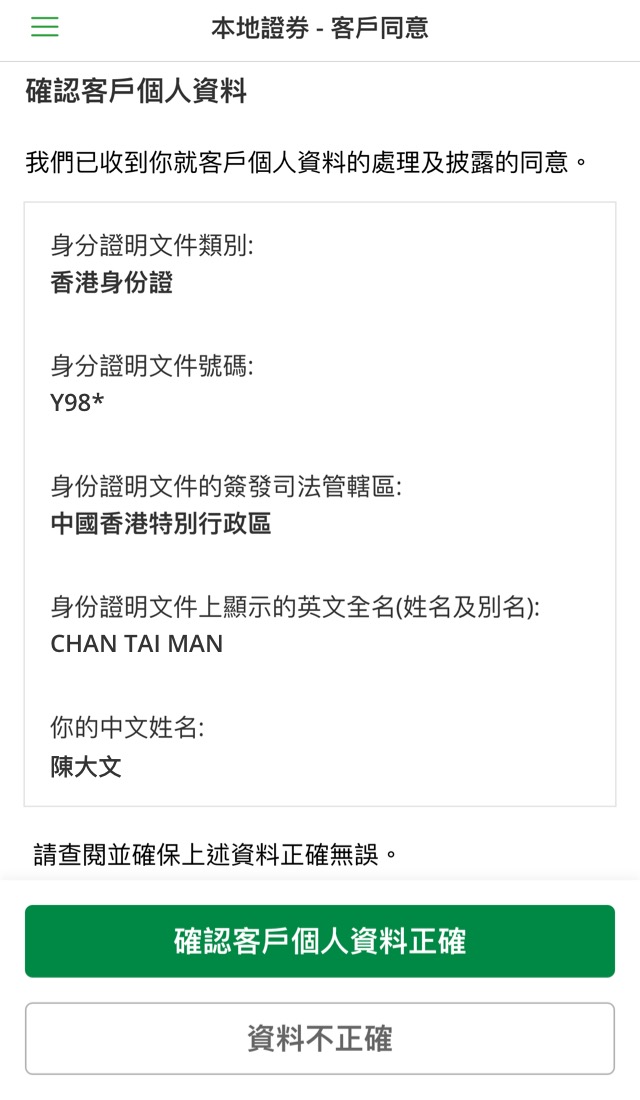 當香港投資者識別碼制度實施後,我們會在收到同一戶口所有戶口持有人的明示同意及按證監會要求的客戶識別資料優先次序而提供的最新個人資料後,編配券商客戶編碼並向聯交所的數據資料庫提交有關識別信息 (即客戶的名稱及身份證明文件資料)。當收到聯交所確認你的客戶身份資料登記,本行會發出短訊通知你 (只適用於個人證券客戶)。