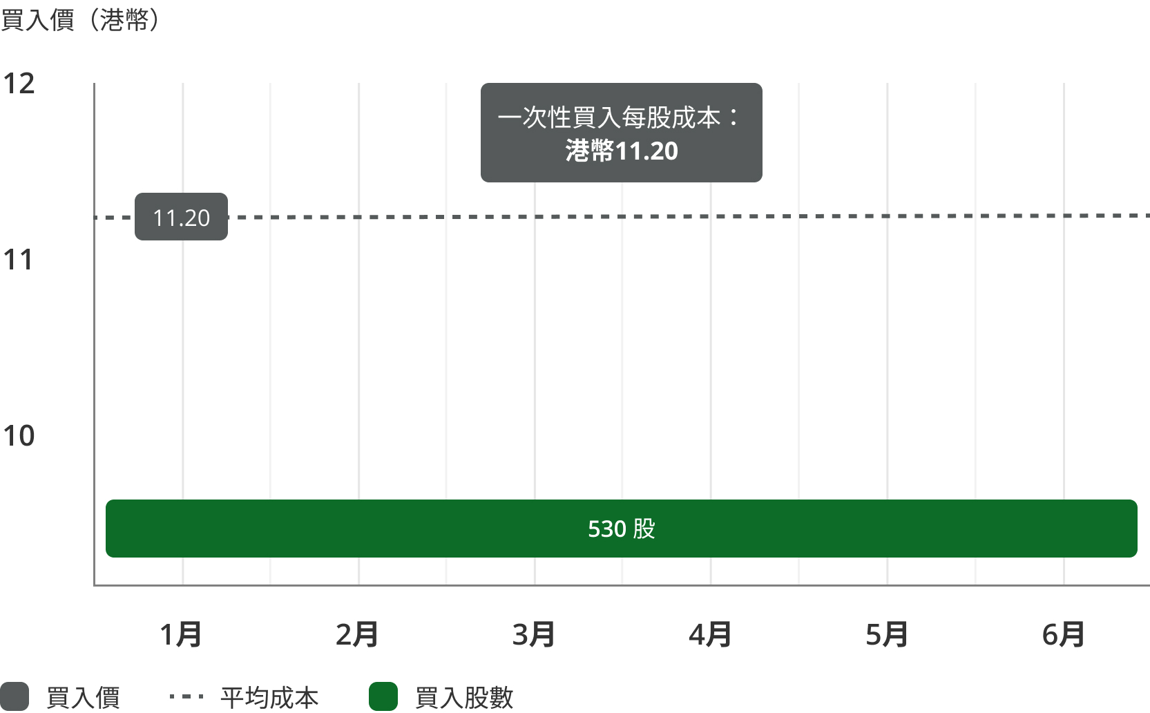透過每月投資計劃,Tom在6個月內一共以港幣5,666買入530股,每股平均成本價為港幣10.69。相比在第一個月以每股港幣11.20一次性買入股票,他節省了港幣370的投資成本(港幣6,036 - 港幣5,666)。[1]