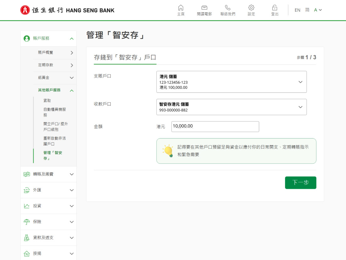 在其他戶口預留足夠資金以應付日常開支(包括水費、電費等家居雜費)、定期轉賬指示和緊急需要,並只將要保護的資金存入「智安存」戶口。 |