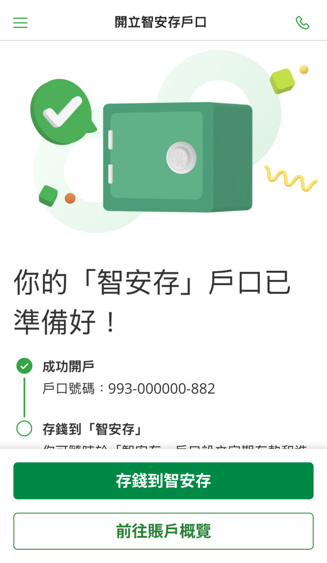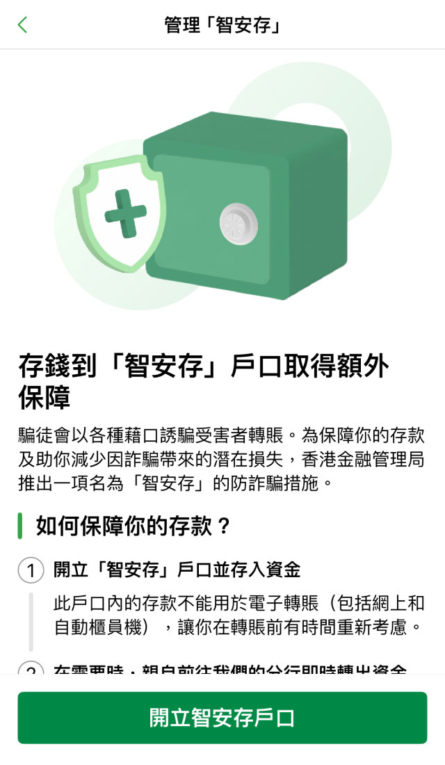 你需要先開立一個「智安存」戶口。戶口成功開立後,你即可存入你想保護的資金。
