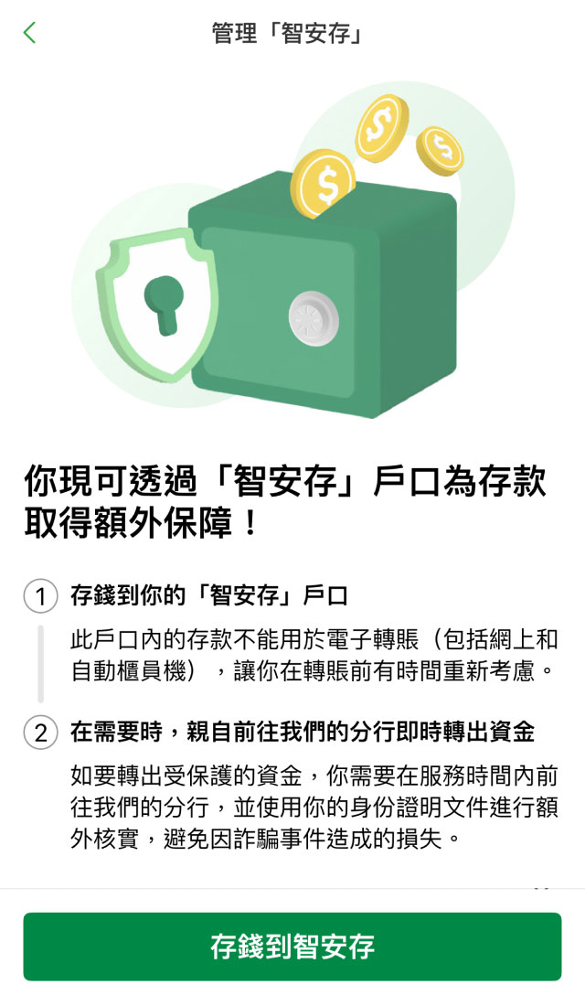 資金存入「智安存」戶口後,就如鎖入「夾萬」。資金不能隨意經電子途徑(包括網上、電話理財和自動櫃員機)提取或轉出。